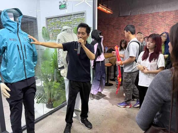 与此同时,2023级服装与服饰设计2班全体学生前往瑞龙科技服饰有限公司进行实践研学。企业聚焦“无缝制衣工艺”,总经理郭总解析“科技驱动功能服饰革新”战略定位,展示工艺升级路径。师生深入无尘车间,观摩运动功能服饰从原料到成品的全流程工艺,重点关注热熔粘合与超声波焊接技术——通过高分子材料融合替代缝线,实现服装零线迹一体化成型。学生近距离观察TPU复合面料精密热压成无缝冲锋衣的全过程,切身感受技术突破对产品形态的重构力量。