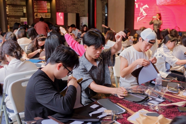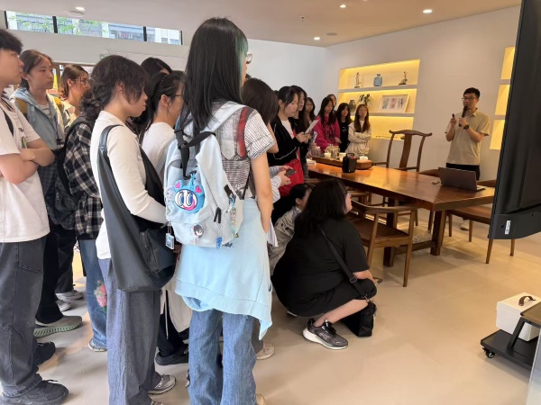 下午,师生共赴百年锦纶会馆,开展香云纱非遗技艺研学活动。香云故里集团董事长王总通过莨绸实物与影像资料,生动阐释“三洗九煮十八晒”古法工艺及“天人共作”的智慧内核,强调“敬畏非遗本真”的活化理念。学生沉浸式体验香云纱手作流程,从裁片缝制到金属铆钉组装,完成兼具传统韵味与现代功能的手作包,切身探索非遗技艺与当代设计的融合可能。