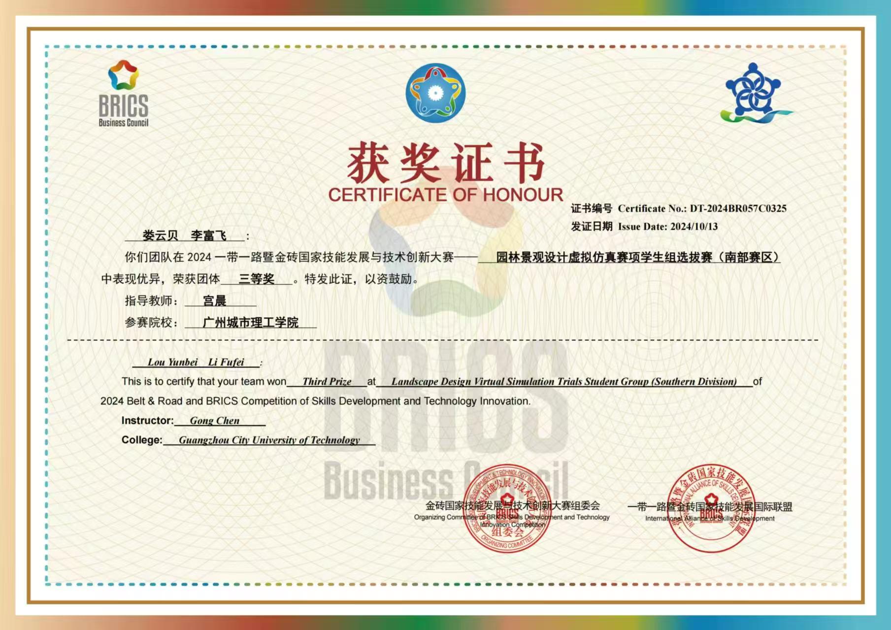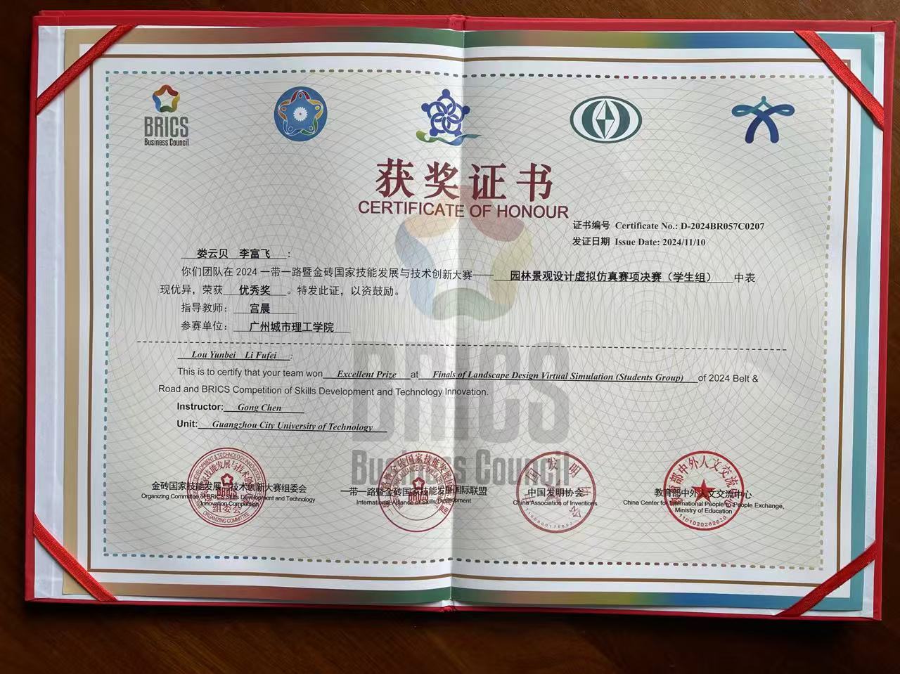 本网讯(记者 宫晨 陈磊)12月30日,建筑学院收到“一带一路”暨金砖国家技能发展与技术创新大赛组委会发来的获奖证书。建筑学院2023级风景园林专业学生首次参赛即通过南部赛区选拔晋级全国总决赛,作品最终获得“园林景观设计虚拟仿真赛项决赛(学生组)”全国赛优秀奖一项。