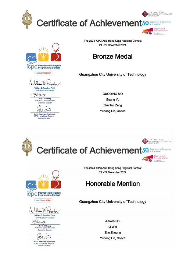 本网讯(记者 林煜东)2月23日,我校收到ICPC国际大学生程序设计竞赛亚洲区域赛(香港站)证书,由计算机工程学院/大数据学院林煜东老师指导的两支参赛队伍脱颖而出,其中“O(n) sort”队(队员:于广、莫国庆、曾振辉)斩获铜奖,“How to sort”队(队员:荘铸、韦力、丘嘉文)获得优胜奖。这是我校继2022年首获铜奖后,第二次在该国际顶级赛事中摘得奖项,展现了计算机学子学科竞赛实力的稳步提升。