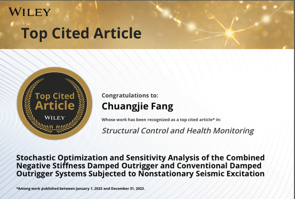 本网讯(记者 杨文娟 方创杰)3月27日,土木工程学院专任教师方创杰博士发表的科研论文——Stochastic Optimization and Sensitivity Analysis of the Combined Negative Stiffness Damped Outrigger and Conventional Damped Outrigger Systems Subjected to Non-Stationary Seismic Excitation获得土木领域国际知名期刊Structural Control and Health Monitoring(中科院二区)发来的2023年期间发表文章的高引用论文证书。