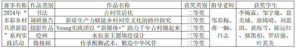 本网讯(记者 邹春梅)3月5日,广东省人民政府地方志办公室公示了2024年“多彩乡村 共谱新篇”系列实践活动获奖名单。马克思主义学院Young实践团报送的书法作品《古祠堂活化》、微视频作品《传承醒狮武术,锻造中华风骨》、调研报告《新质生产力赋能乡村祠堂文化的路径探究》、摄影作品《Young实践团以“新媒体+”助力千年古村潮起来》、绘画作品《水仙茶主题墙绘设计》从15216件作品中脱颖而出,荣获二等奖一项、三等奖四项。
