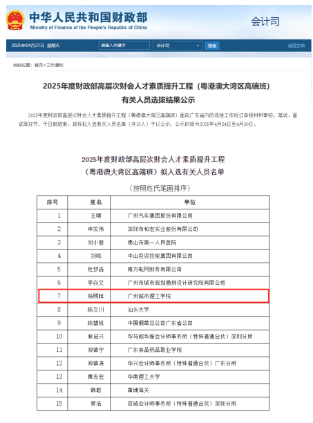 本网讯(记者 黄凤娟)4月24日,财政部公布了2025年度财政部高层次财会人才素质提升工程(粤港澳大湾区高端班)入选名单。我校国际商学院杨明晖教授成功入选,成为本次入选名单中唯一来自民办高校的会计学者。