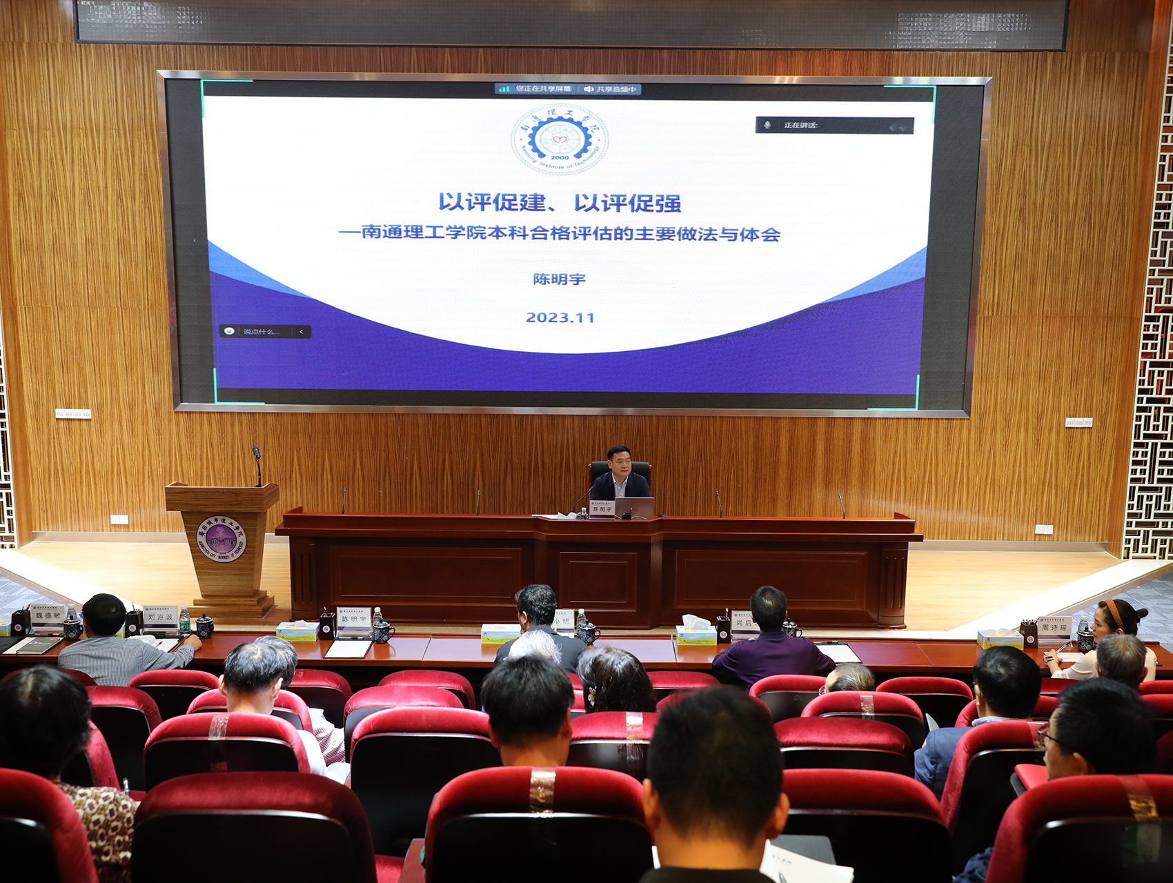 会上,陈明宇作《以评促建、以评促强,南通理工学院本科合格评估的主要做法与体会》专题报告。他首先简要介绍了南通理工学院的办学理念、发展历程以及在教学、科研等方面取得的办学成绩。随后,他详细分享了南通理工学院在迎接合格评估过程中的主要做法,包括迎评的五个阶段、迎评的决策定位以及迎评具体做法。陈明宇强调,合格评估是对学校的一次全面检查,要深刻理解以评促建、以评促管、以评促改、评建结合、重在建设的指导思想。同时,他还分享了学校在迎评工作中需要重点关注的问题,如合格评估中不合格出现最多的10个观测点、对照指标体系容易出现的问题、民办高校普遍存在的短板和难点、专家现场考察时关心的核心问题等。