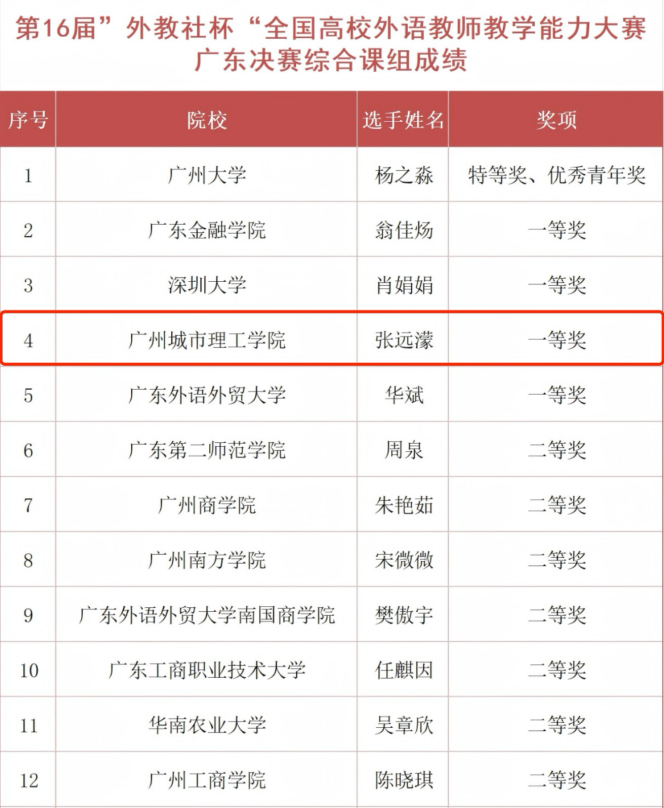 本网讯(记者 邓昕婧)6月7日,第16届“外教社杯”全国高校外语教学能力大赛(大学英语组)广东省决赛圆满落幕。本次大赛分为综合组和听说组两个组别,吸引了全省多所本科院校的优秀教师参与角逐。经过初赛、复赛的层层选拔,我校外国语学院青年教师张远濛凭借扎实的专业素养、创新的教学设计和出色的临场表现,在决赛中脱颖而出,荣获综合组一等奖,展现了我校外语教师的风采。