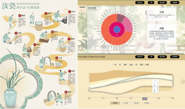 张家瑜、高毅、李俊明同学设计的作品《汝瓷制作工艺可视化设计》运用现代信息可视化技术,整合汝瓷历史、工艺、艺术、文化等多维度数据,通过精妙交互设计、清晰数据图表和东方美学视觉呈现,多维度展现汝瓷魅力。作品涵盖开采、淘石等十大制作工序,解析胎釉热胀冷缩差异形成蝉翼纹等独特开片的原理,呈现以天青色为主的釉色、多样开片纹理及瓶、杯托等丰富器型。周璐、黄英源、禤思云、植子莙、余俊烽同学设计的作品《古韵千秋》,基于古代传统乐器,结合可交互式可视化技术,以传播中国古代传统文化为目的,设计能增强挖掘传播效能的乐器文化数字化平台,致力于达到文化传承与保护、知识传播与教育和艺术欣赏等社会效益。