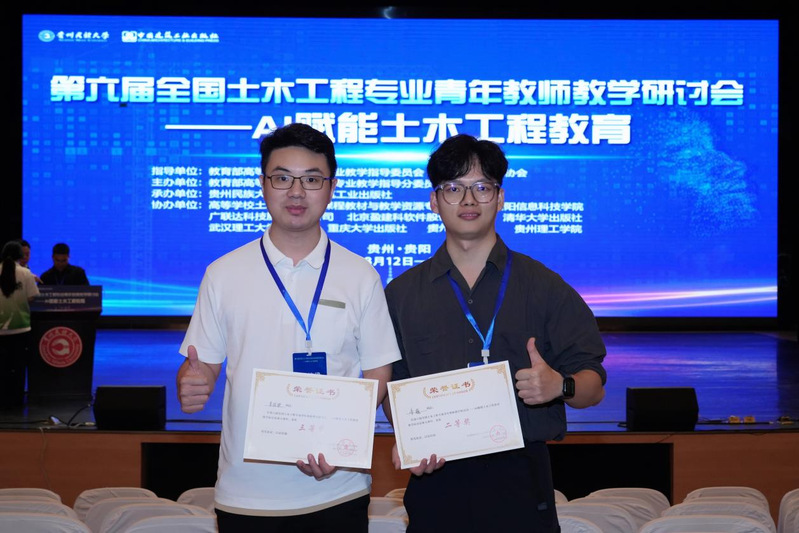 本网讯(记者 肖栋梁)8月12日至15日,第六届全国土木工程专业青年教师教学研讨会在贵阳隆重举行。本次研讨会由教育部高等学校土木工程专业教学指导分委员会主办,贵州民族大学与中国建筑工业出版社承办。本次研讨会以“AI赋能土木工程教育”为主题,聚焦人工智能技术与专业教学的深度融合。在研讨会核心环节——青年教师说课竞赛中,我校土木工程学院教师李巍荣获全国二等奖、肖栋梁荣获全国三等奖,展现了我校青年教师的教学创新实力。土木工程学院院长季静教授带队参会并指导竞赛。