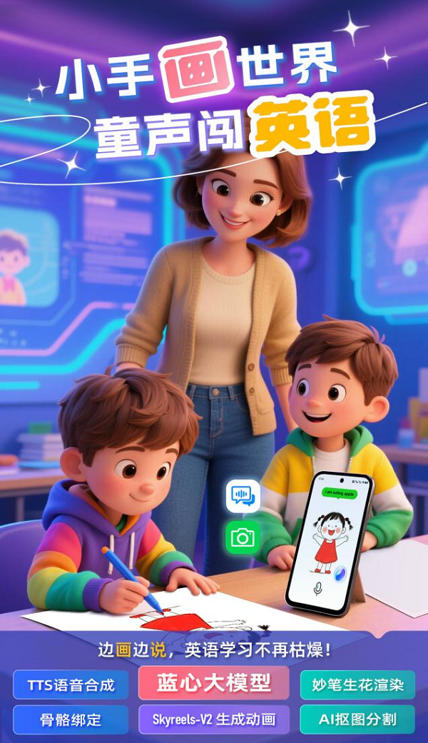 学院参赛团队通过运用蓝心大模型矩阵API,专为儿童、家长及教师量身打造了一款绘说绘画软件。该软件以vivo蓝心大模型作为“大脑中枢”,辅以妙笔生画模型进行背景渲染,将小朋友的涂鸦变成动起来的故事角色,帮助小朋友愉快地学英语。蓝心大模型作为核心引擎,通过专属Prompt模板精准定位“儿童助手”角色,采用“童趣”语言风格与幼儿互动,同时提炼关键词以供妙笔生画生成角色背景,并优化剧情文本,有效弥补了传统绘画工具互动性不足、语言学习缺乏真实情境的短板。借助Grounded-SAM-2技术,软件可快速分离手绘角色,再通过Animated Drawings实现角色动作绑定,Skyreels-V2引擎则负责编排生成英语情景动画,不仅有视觉高亮、语音跟读等功能,而且还支持智能更换背景,带来沉浸式教育体验。