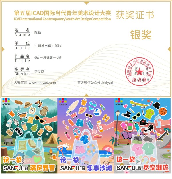 在本次大赛中,珠宝学院视觉传达设计专业学生陈钧的作品荣获银奖。该作品以三福透明购物袋为视觉中心,巧妙地将品牌商品与多元生活场景相结合。购物袋中喷发出的各类物品构成充满动感与趣味的画面,生动传达了三福商品丰富多样、能满足不同生活需求的品牌内涵。作品凭借独特的创意构思、鲜明的色彩运用,精准传达出品牌年轻、时尚、充满活力的形象。