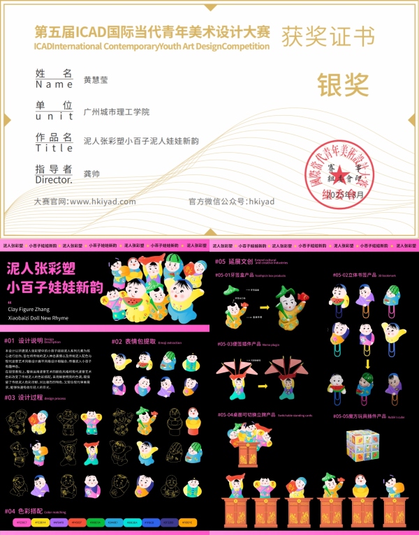 同样荣获银奖的还有珠宝学院视觉传达设计专业学生黄慧莹的作品,该作品聚焦于非物质文化遗产的创新表达。设计以“泥人张”彩塑中的小百子娃娃形象为核心元素,巧妙地将传统人物的神态表情与配色与现代波普艺术风格相融合。作品在视觉上运用鲜艳明亮的色调,既保留了传统泥人色彩浓郁、对比强烈的特色,又完全契合现代审美,成功塑造出能够快速吸引年轻人目光、传播传统艺术趣味的现代形象。