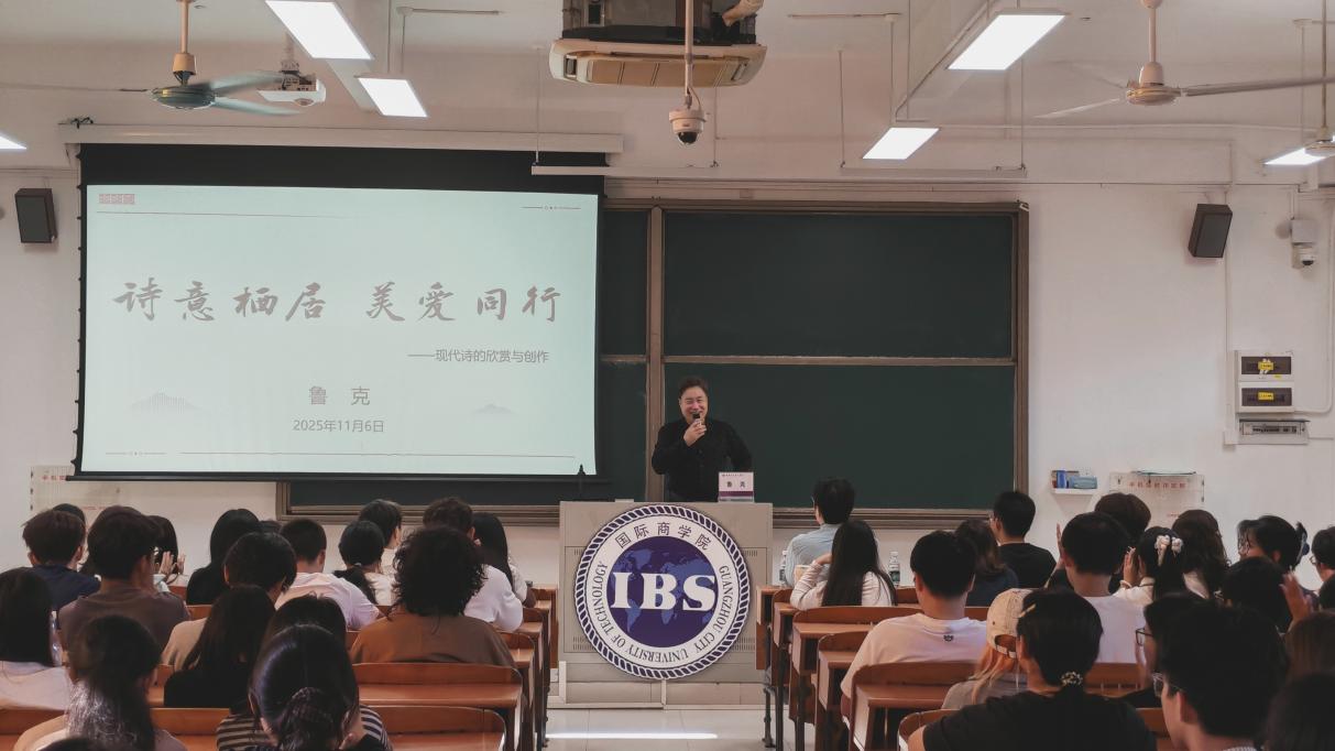 本网讯(记者 黄增光)为深化美育浸润行动,培育具有全球胜任力的应用型人才,11月6日,国际商学院在A5-204教室举办“诗意栖居 美爱同行”悦·读专题讲座。特邀著名作家、诗人鲁克主讲,学院院长安然教授、党总支副书记梁伟滔及师生代表100余人参与,通过“四美”“四度”“四有”独特视角解码现代诗鉴赏密码,现场互动热烈,反响斐然。