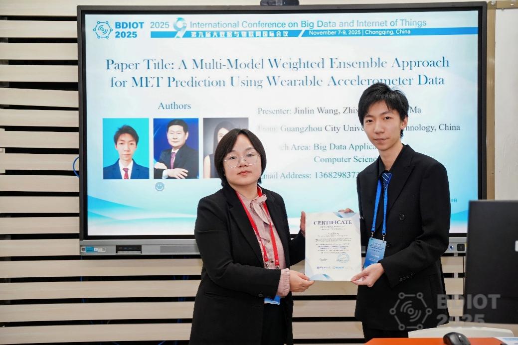 本网讯(记者 马琦)11月8日,从第九届大数据与物联网国际会议(BDIOT 2025)传来喜讯,我校管理学院2022级大数据管理与应用专业王瑾蔺同学以第一作者身份发表题为《A Multi-Model Weighted Ensemble Approach for MET Prediction Using Wearable Accelerometer Data》的学术论文被国际会议录用,纳入EI检索,并在会议上作全英文口头汇报。该研究聚焦智慧健康领域,以可穿戴设备的动态时间序列运动数据,通过多模型加权集成方法,精准预测人体能量代谢(MET)。与会专家认为,此研究为可穿戴设备在健康监测中的应用提供了新思路。